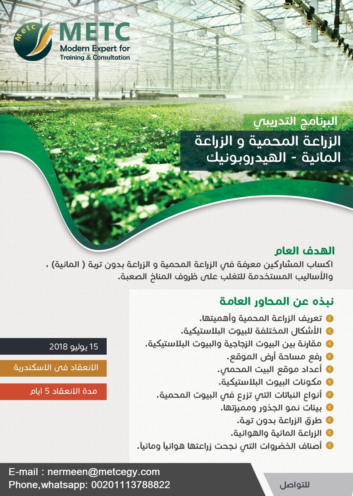 بنهاية البرنامج التدريبي يحصل المتدرب على - شهادة معتمدة من مركز الخبرة الحديثة للتدريب و الاستشارات المعتمد من مجلس تحديث الصناعة ( وزارة التجارة و الصناعة المصرية ) بالأضافة الى ذلك فأن المتدرب يحصل على شهادة معتمدة من جانبنا ( حسب الرغبة ) - شهادة معتمدة من جامعة كامبريدج البريطانية - شهادة معتمدة من جامعة عين شمس - شهادة معتمدة من كامبريدج مع التوثيق من الخارجية البريطانية - شهادة معتمدة من المعهد القومي للبحوث مع التوثيق من الخارجية المصرية للاستفسار و الرد على كل اسألتكم ** التكلفة / المواعيد / المحتوى العلمي } و للتسجيل بالدورات يشرفنا التواصل معكم أ / نرمين بديع Nermeen Badya Training coordinator nermeen@metcegy.com mob, whatsapp,viber 00201113788822 يسرنا ان نعلن لكم عن بدء التسجيل في دورة الزراعة المحمية و الزراعة المائية - الهيدروبونيك الاسكندرية - 15 يوليو 2018 الاهداف إكساب المشاركين معرفة في الزراعة المحمية و الزراعة بدون تربة ( المائية)، والأساليب المستخدمة للتغلب على ظروف المناح الصعبة. بعض من محاور الدورة